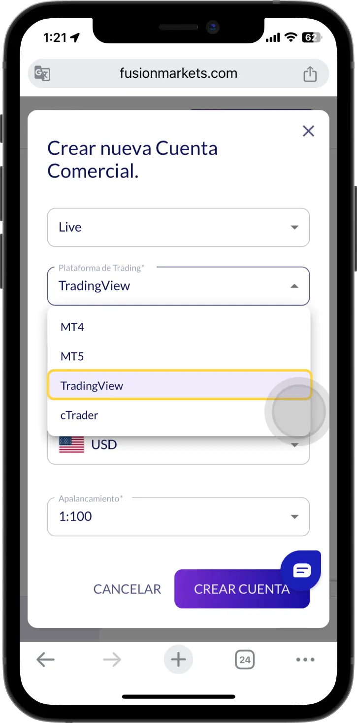 Desafortunadamente, la integración entre Fusion Markets y TradingView se completa abriendo una cuenta TradingView separada desde Fusion Client Hub. Para hacer esto, ab ra una nueva cuenta real en su Client Hub y seleccione "TradingView" como plataforma. Si desea obtener instrucciones más detalladas sobre cómo hacerlo, véalas aquí .