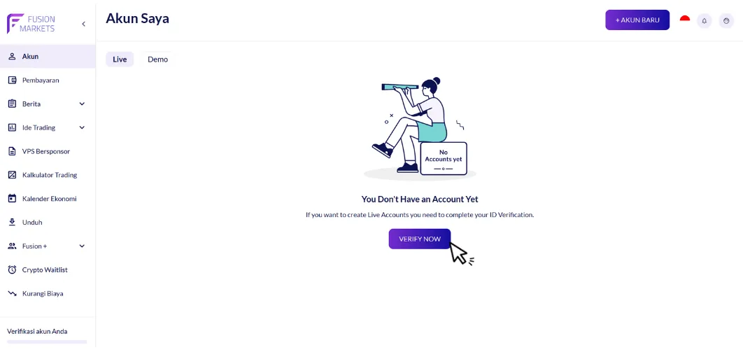 Fusion Markets menawarkan pilihan kepada klien antara akun trading demo dan live. Akun demo berfungsi sebagai sumber daya berharga bagi para trader pemula yang ingin mencoba aktivitas trading tanpa membahayakan uang mereka. Akun ini menyediakan lingkungan trading virtual yang sangat mirip dengan pasar riil sehingga para trader bisa menguji dan menyempurnakan strategi mereka.