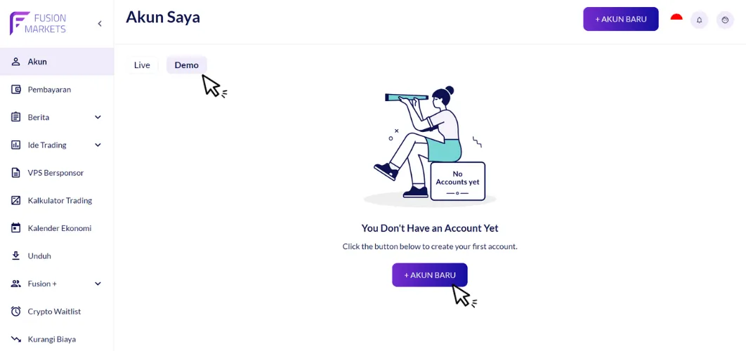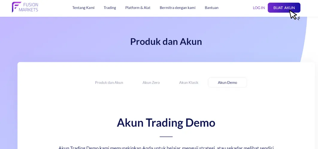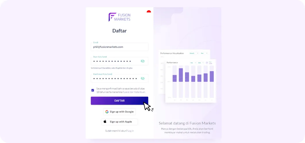 Ikuti panduan langkah-langkah berikut untuk membuka akun Demo di Fusion Markets. Manfaatkan kemampuan perangkat trading canggih dan data pasar real-time kami, yang memungkinkan Anda mengeksekusi trade dengan tepat dan percaya diri. Uji strategi, sempurnakan teknik pengambilan keputusan, dan temukan pendekatan ideal yang sesuai dengan gaya trading Anda, semua tanpa membahayakan uang sepeser pun.