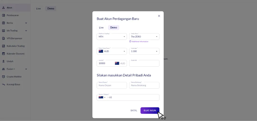 Pastikan untuk memilih ‘Demo’ lalu isi detail Anda dan klik ‘Buat Akun’